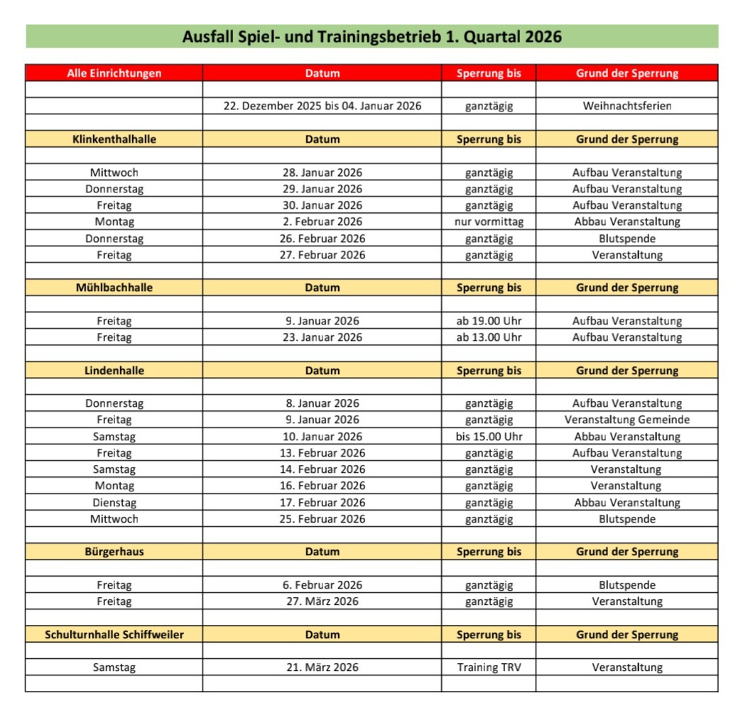 Ausfall Trainingszeiten Hallen 1. Quartal 2026
